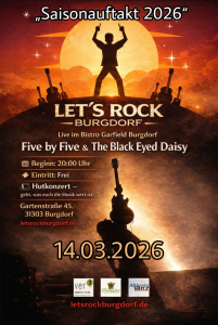 « Alle Veranstaltungen Let´s Rock Burgdorf im Bistro Garfield Burgdorf März 14 @ 20:00 - 23:30 Frei « Mukkerfriday Let´s Rock Burgdorf in der „Neue Schauburg Burgdorf“ » Mit Five by Five und Black Eyed Daisy Zum Kalender hinzufügen Google Kalender iCalendar Outlook 365 Outlook Live Details Datum: März 14 Zeit: 20:00 - 23:30 Eintritt: Frei Veranstalter Bistro Garfield Burgdorf Veranstalter-Website anzeigen Veranstaltungsort Bistro Garfield Burgdorf Gartenstr. 45 Burgdorf, 31303 Germany Google Karte anzeigen Veranstaltungsort-Website anzeigen